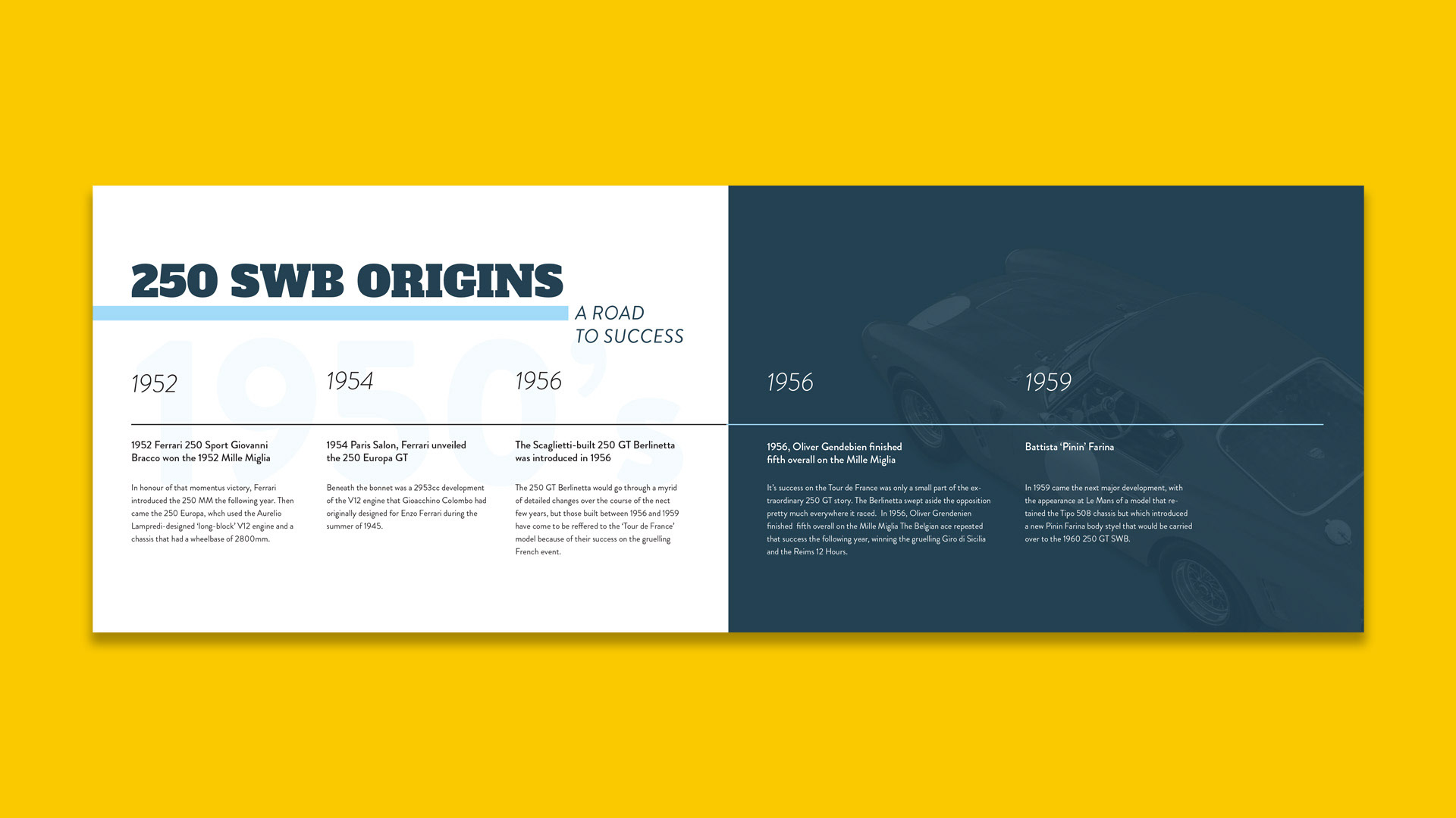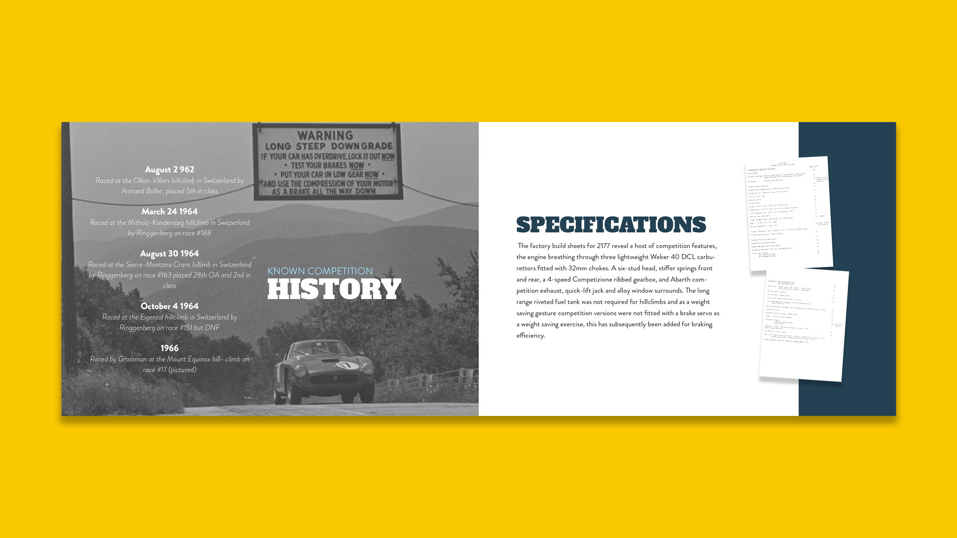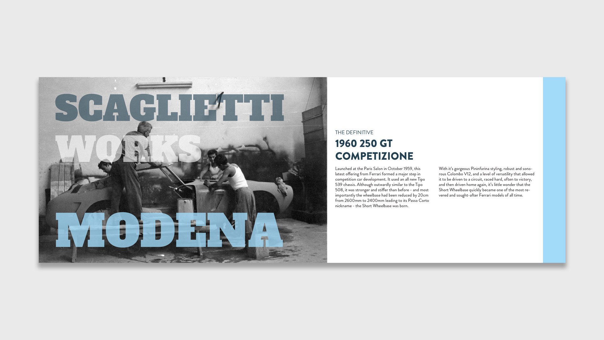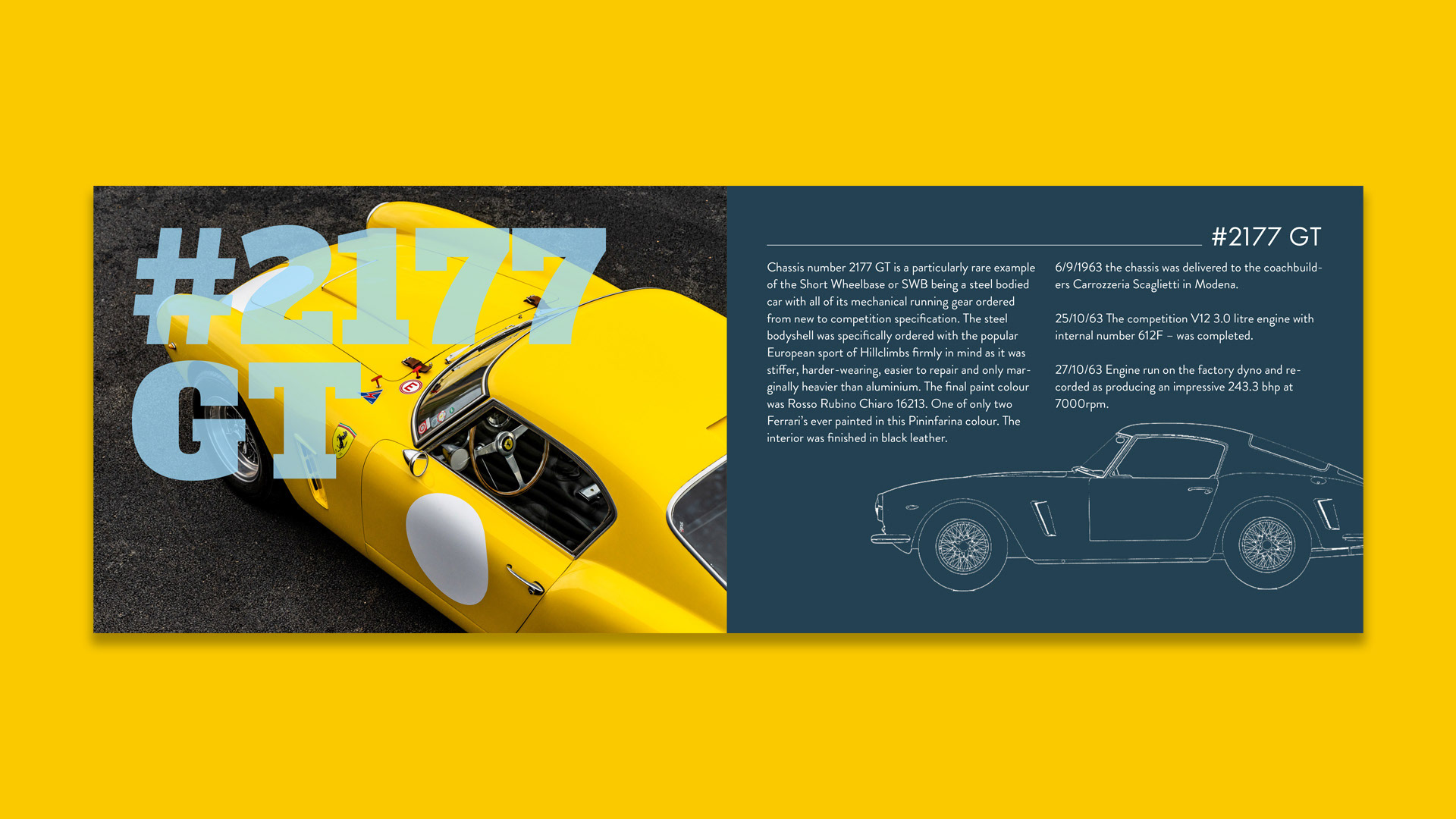 During my time with The Classic Motor Hub, I was exposed to some of the greatest cars of all time. This 1960 Ferrari 250 SWB is one of those cars. I designed this bespoke brochure for the company sales team for sending out to prospects and HNWI.